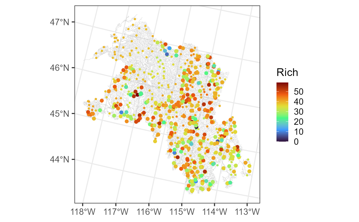 geom_sf(data = bugs$obs, aes(color = Rich), size = 2) +