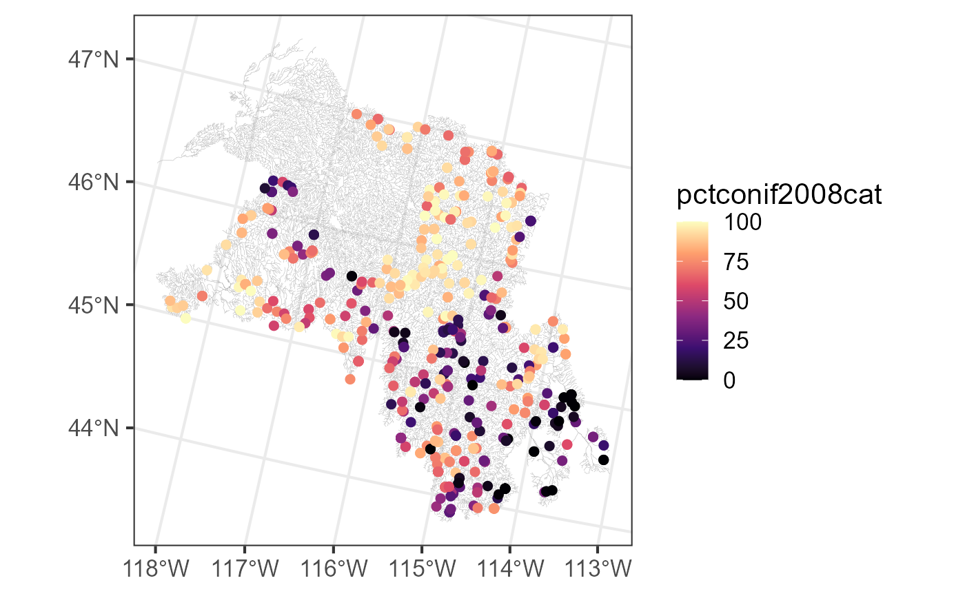 geom_sf(data = bugs$obs, aes(color = pctconif2008cat), size = 2) +