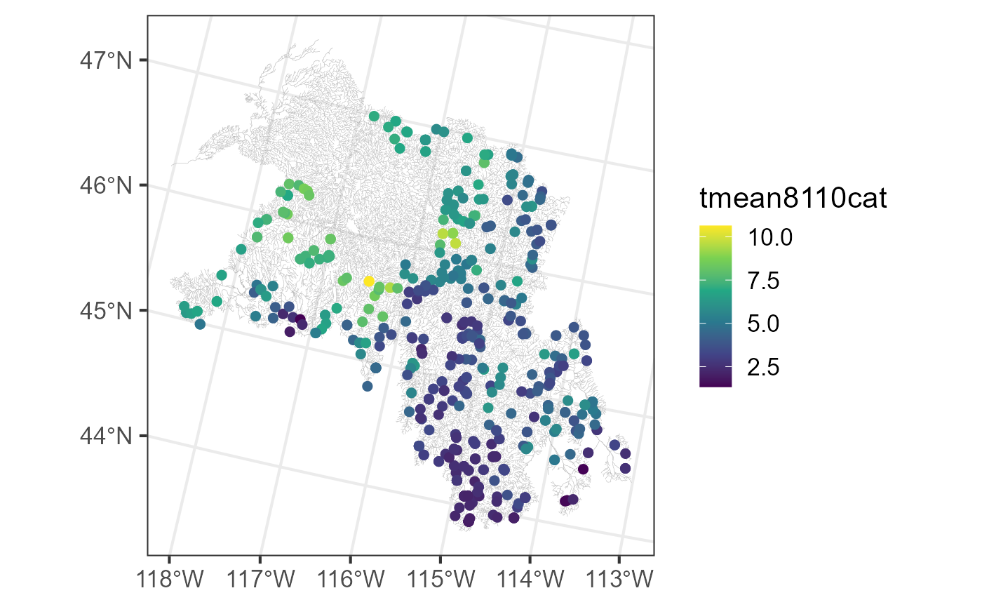 geom_sf(data = bugs$obs, aes(color = tmean8110cat), size = 2) +