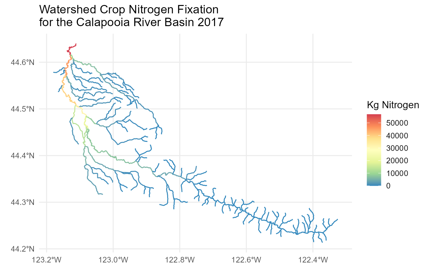 ggtitle('Watershed Crop Nitrogen Fixation \nfor the Calapooia River Basin 2017')